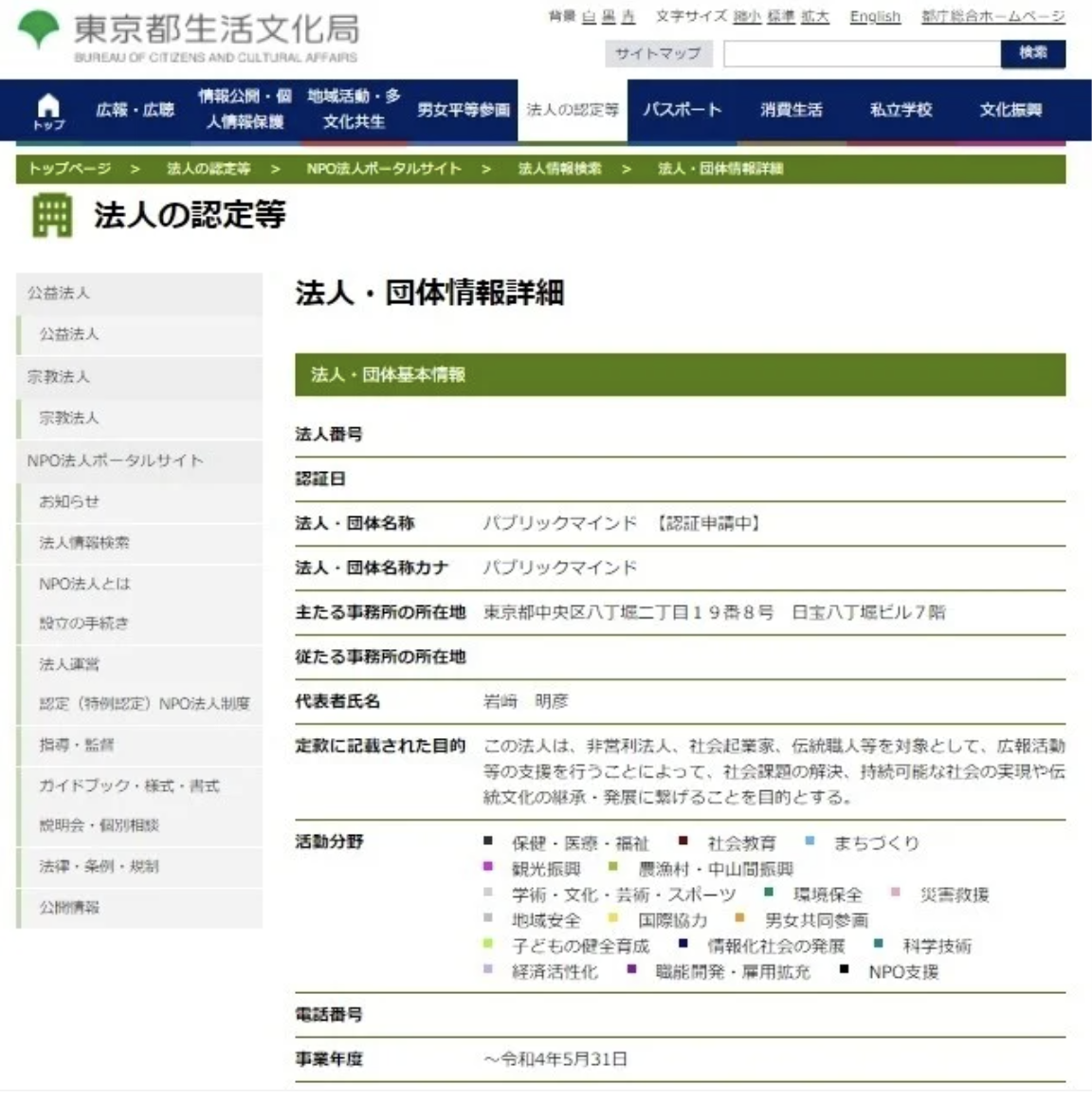 はい、パブリックマインドは特定非営利活動法人(以下、NPO法人)になります。